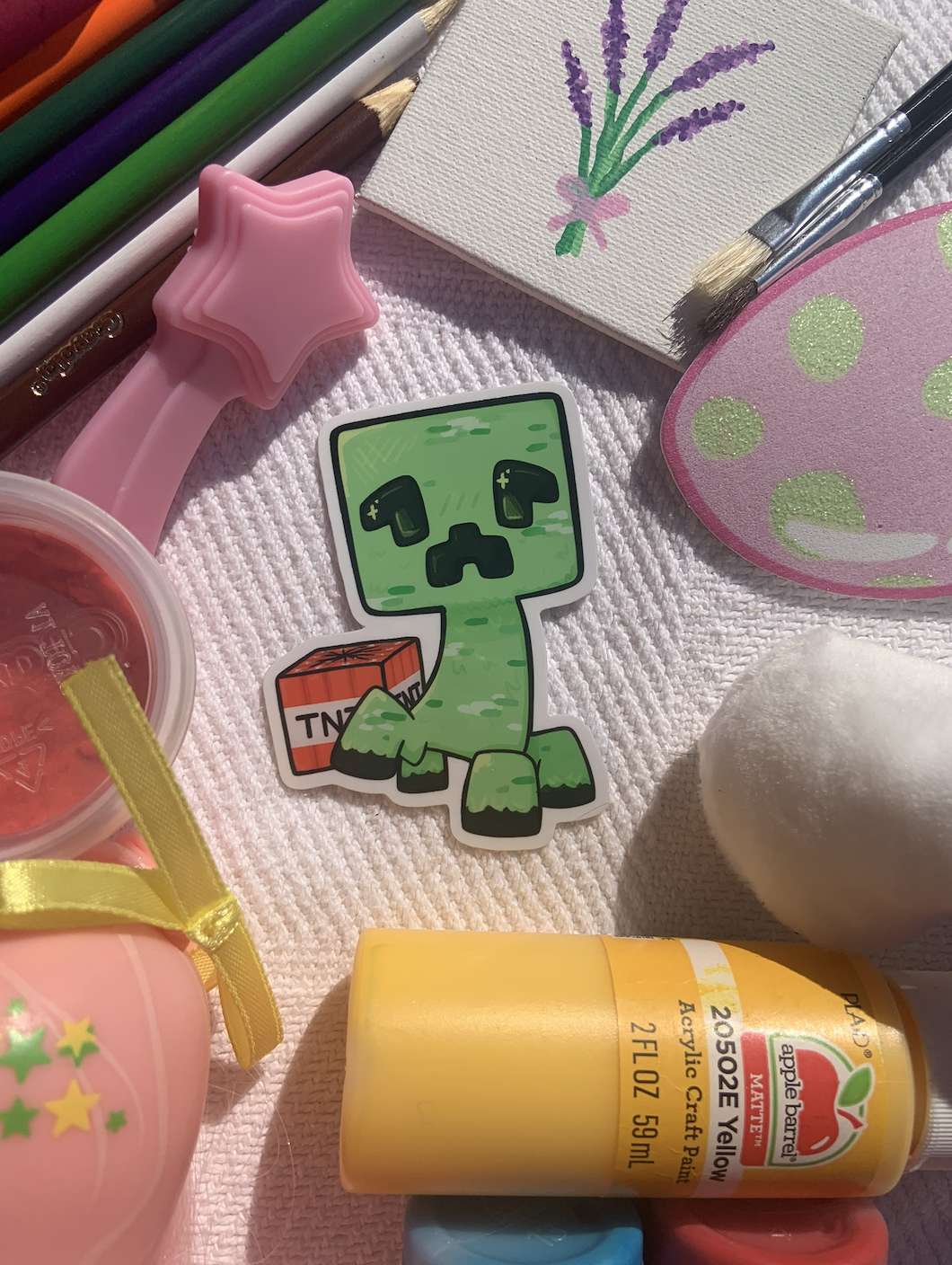 A glossy 3″x3″ sticker of a creeper from Minecraft.