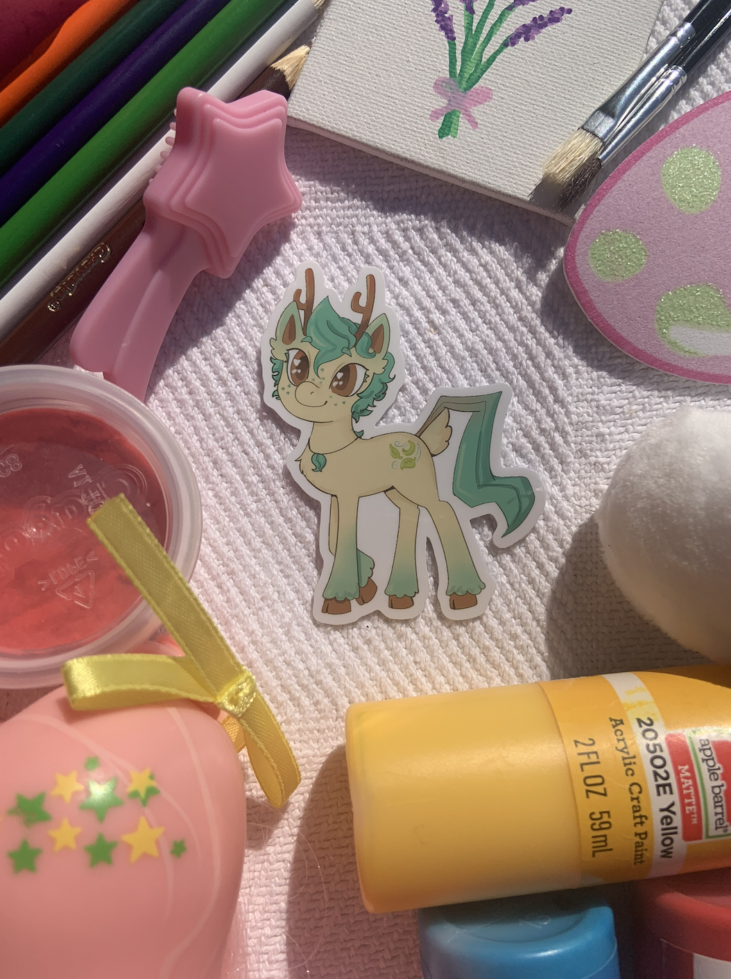 A glossy 3″x3″ sticker of a pony that looks like a Leafeon.
